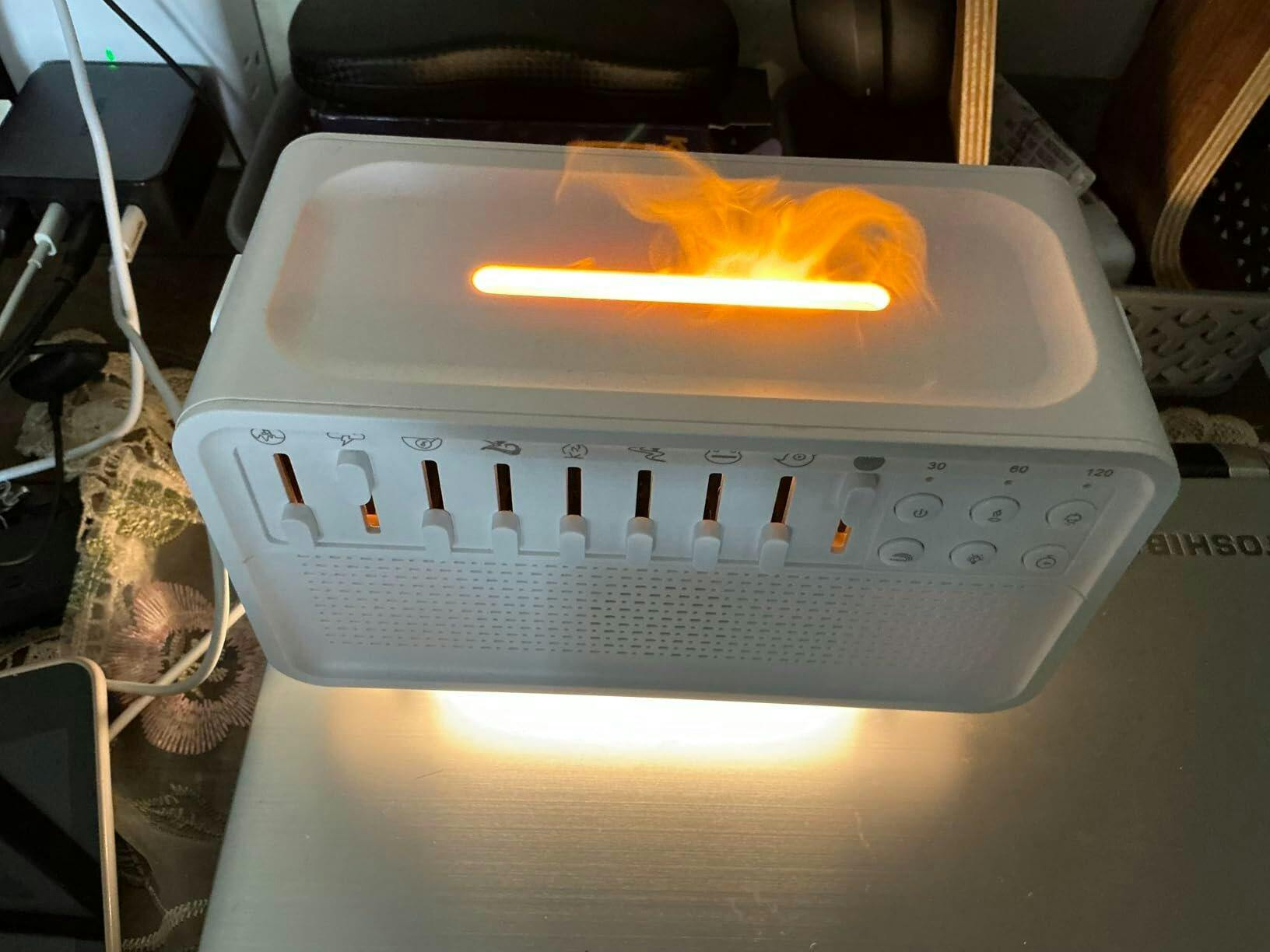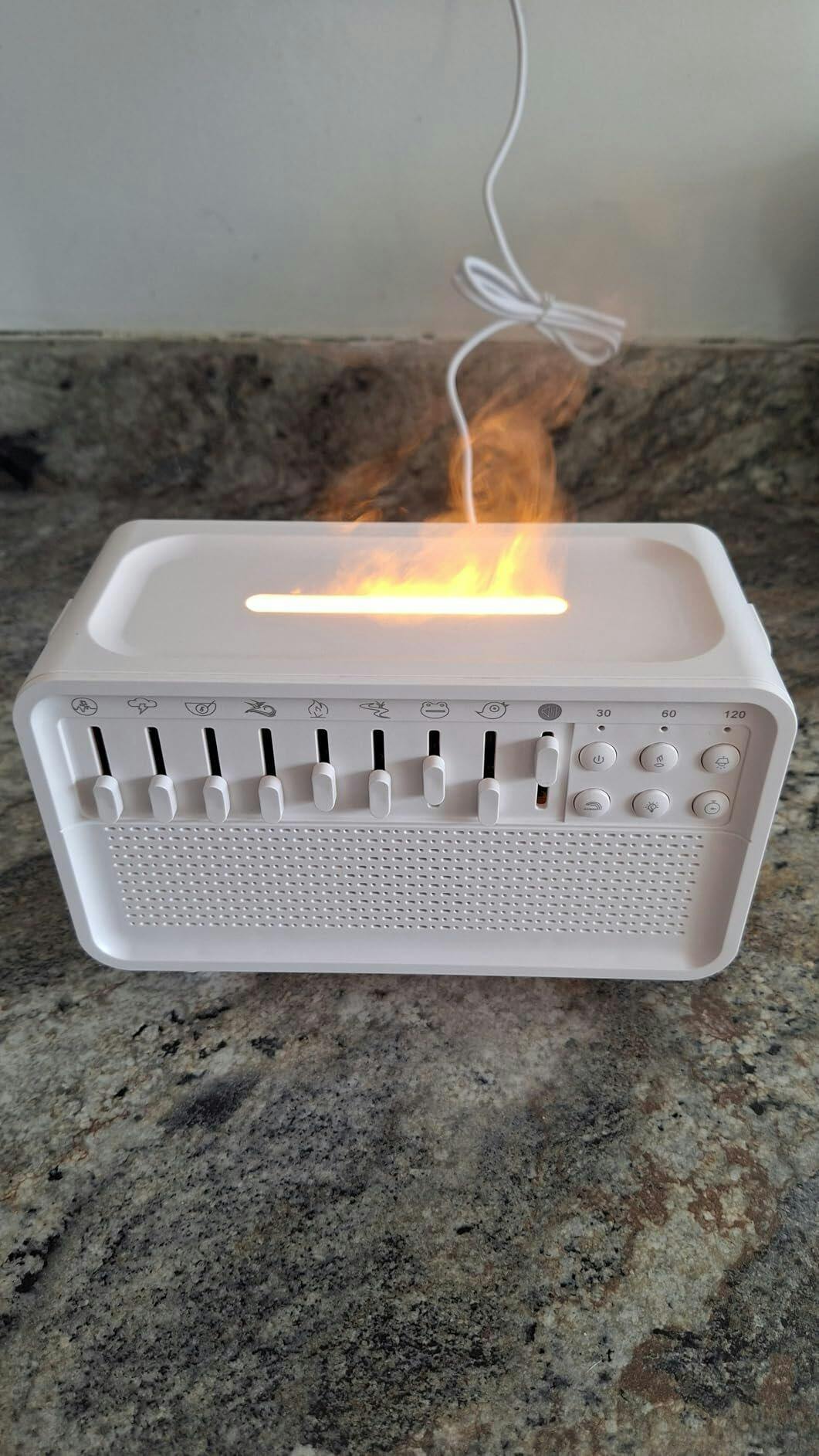 • Sleep-friendly lighting: warm top “flame” + under-glow lights, 30/60/120-min timers, low noise 36–45 dB.